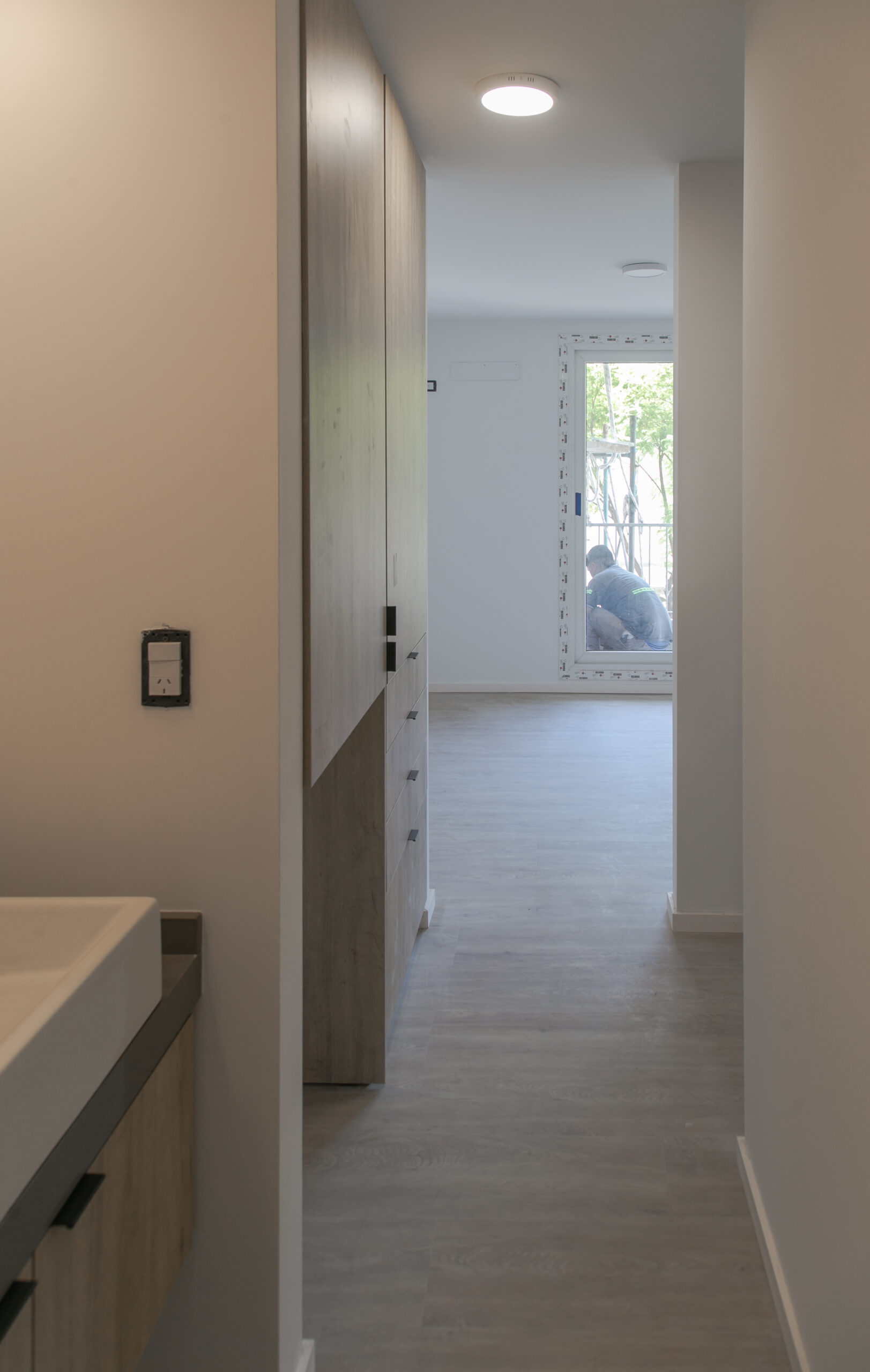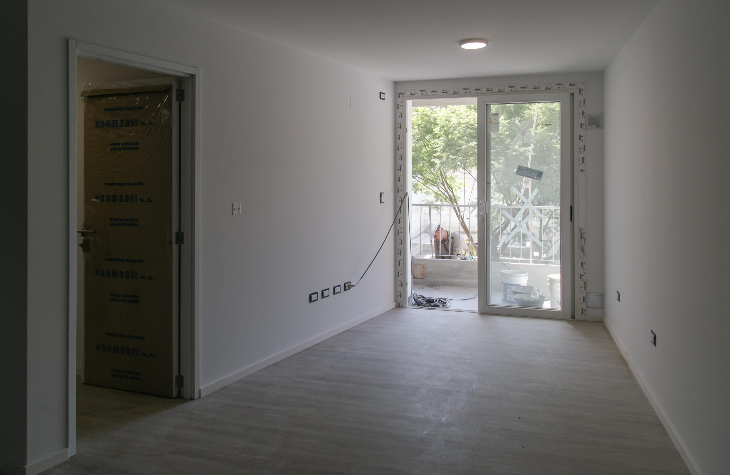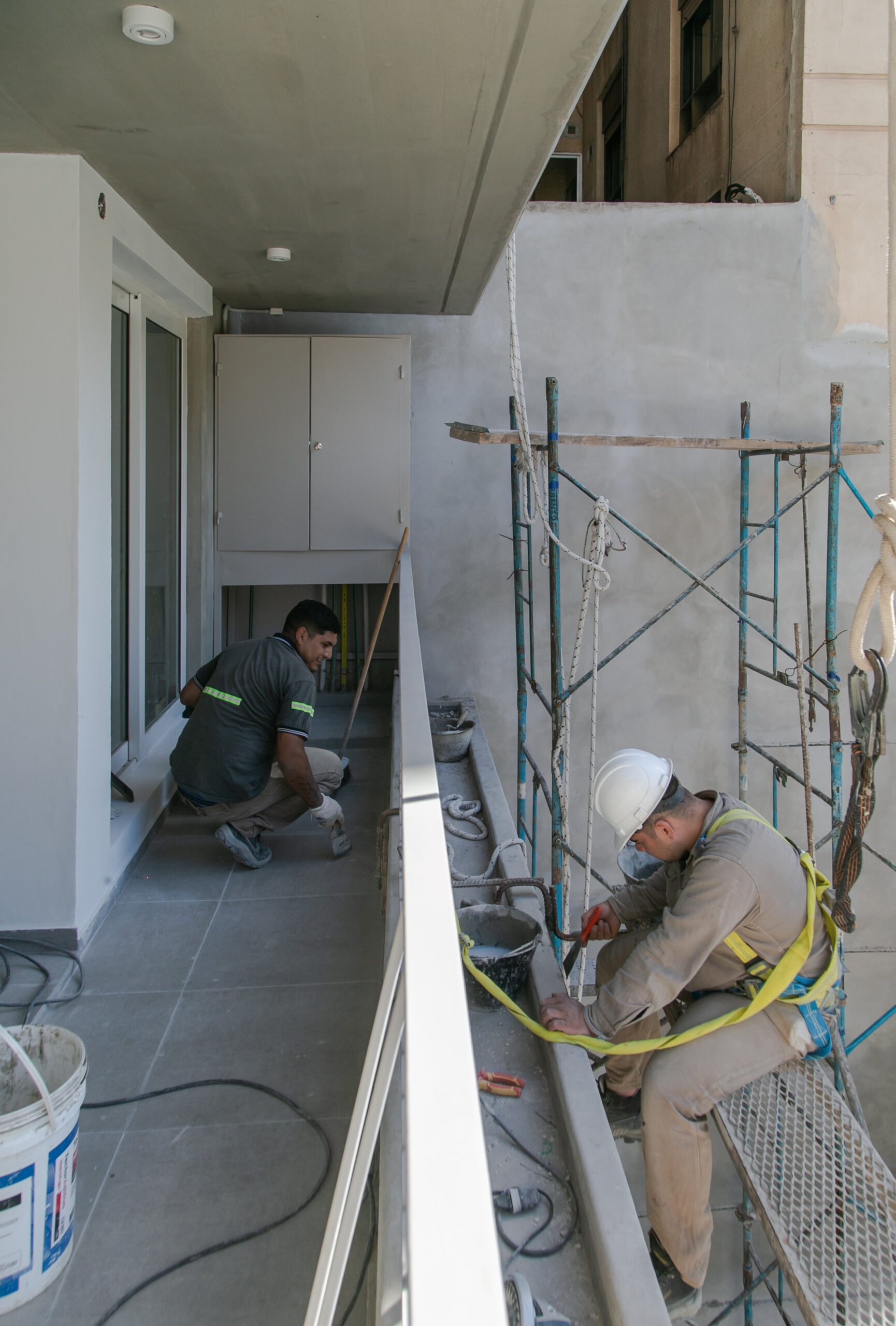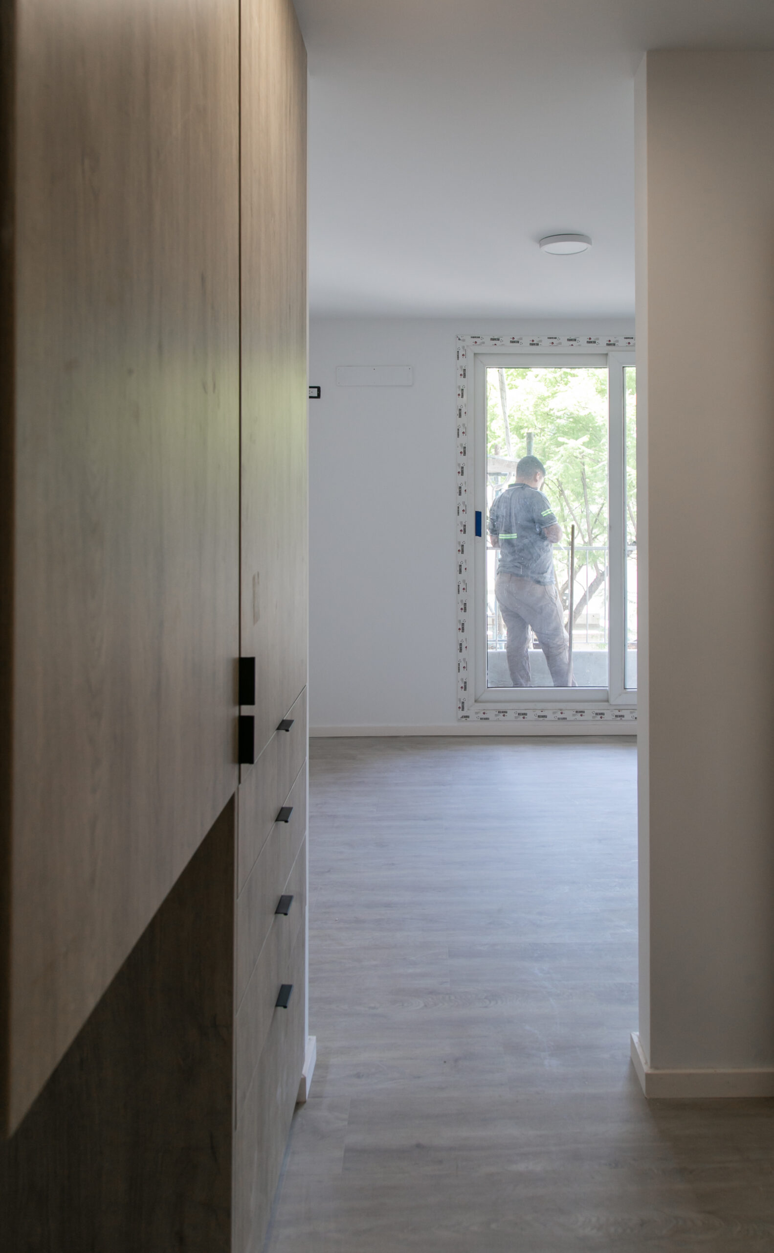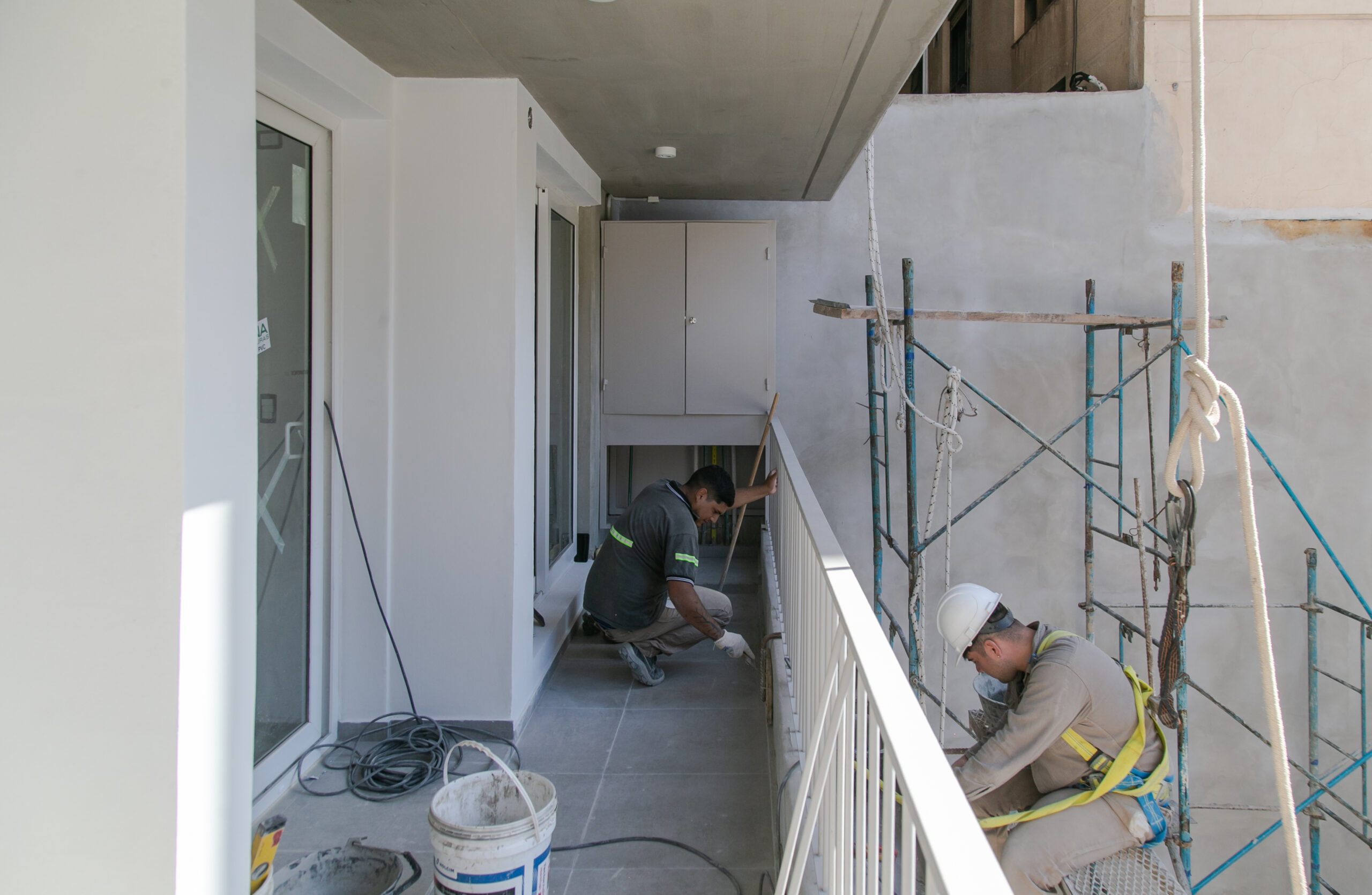 INTERIORES DE DPTO: COLOCACIÓN DE ABERTURAS EN PISOS SUPERIORES - CONTINÚA COLOCACIÓN DE MUEBLES Y MESADAS - COLOCACIÓN DE PISO VINILICO