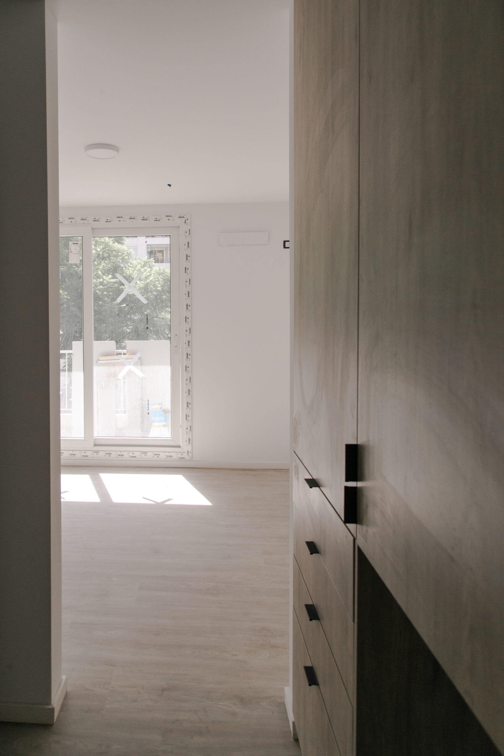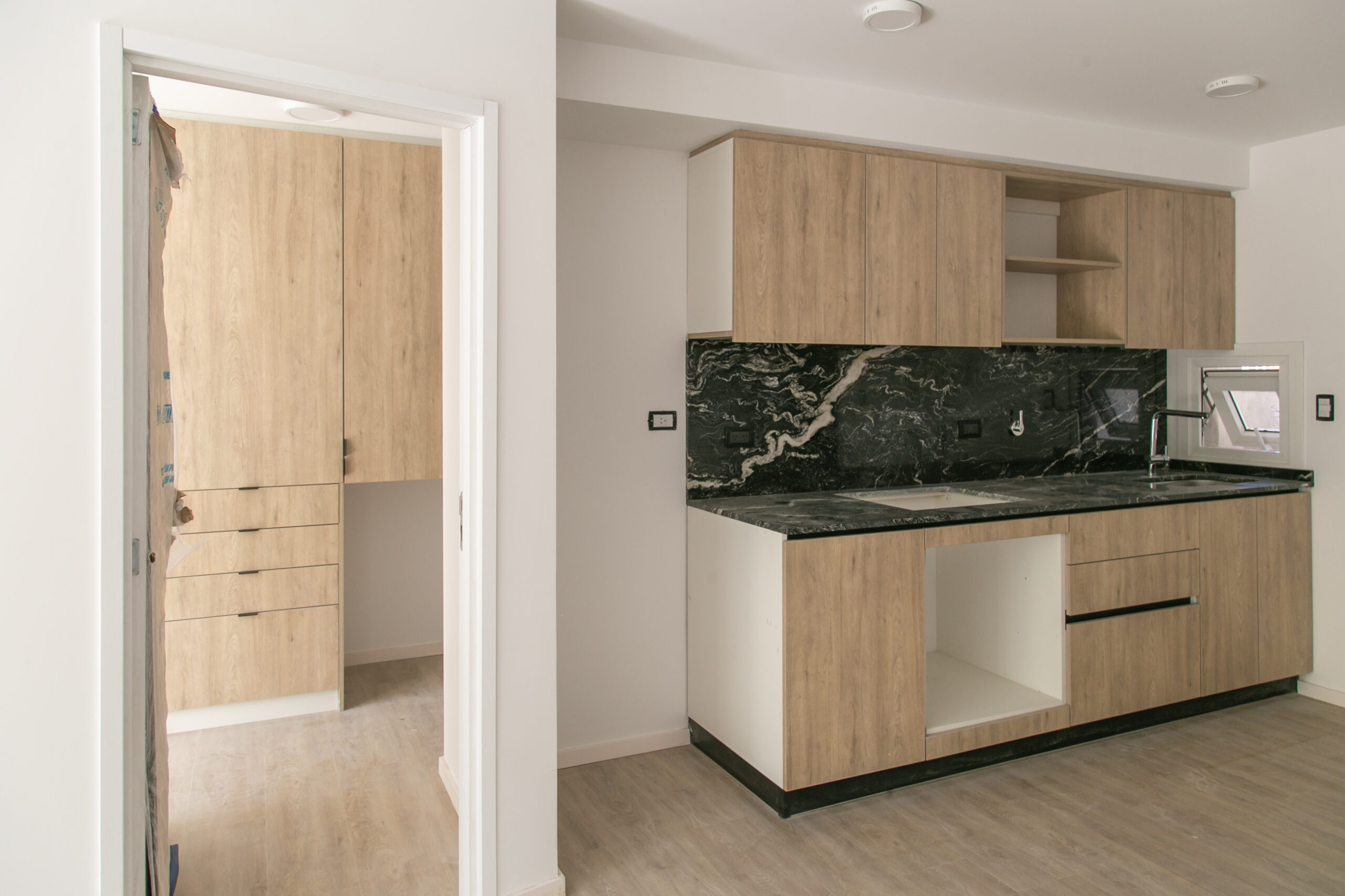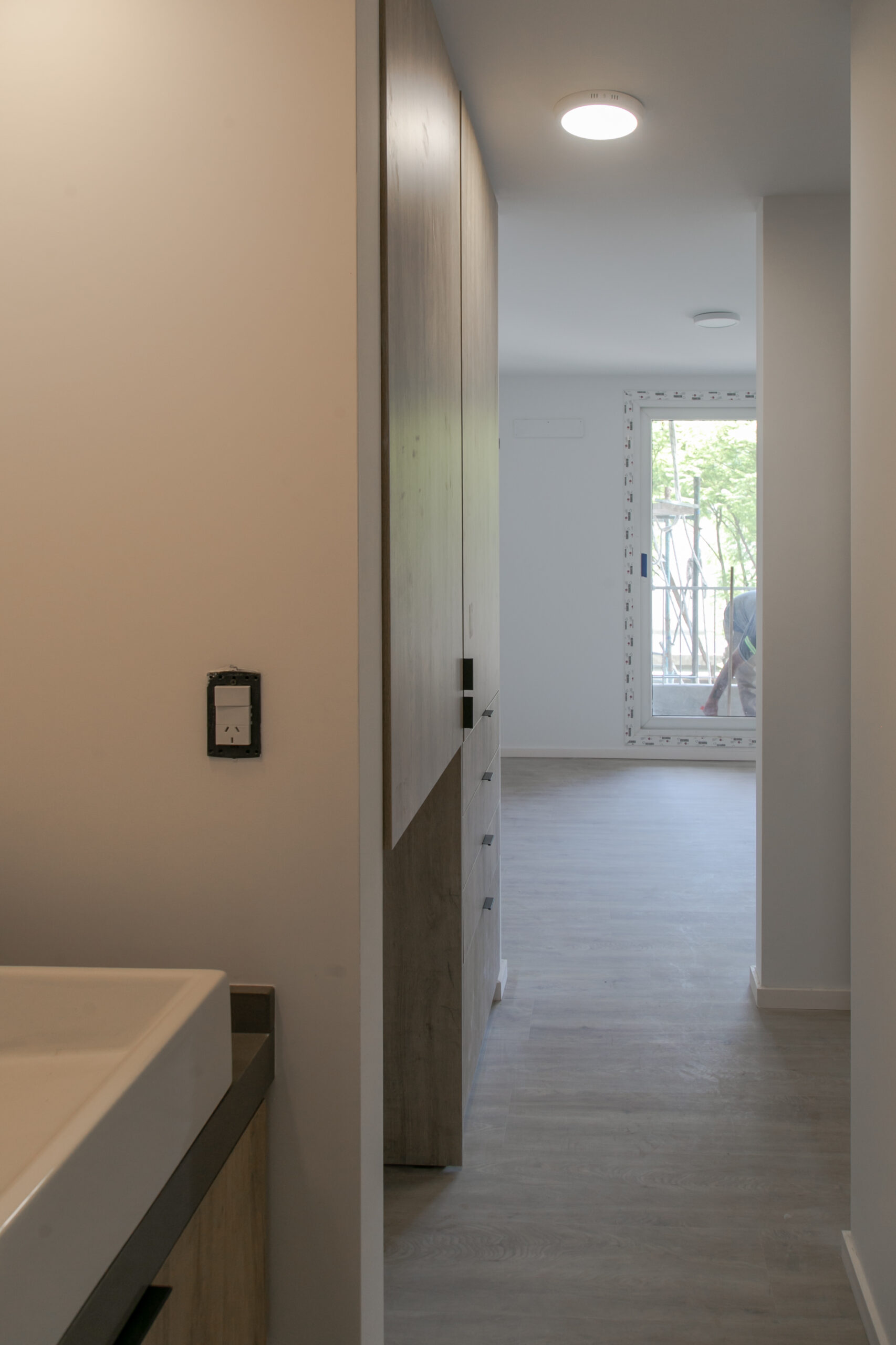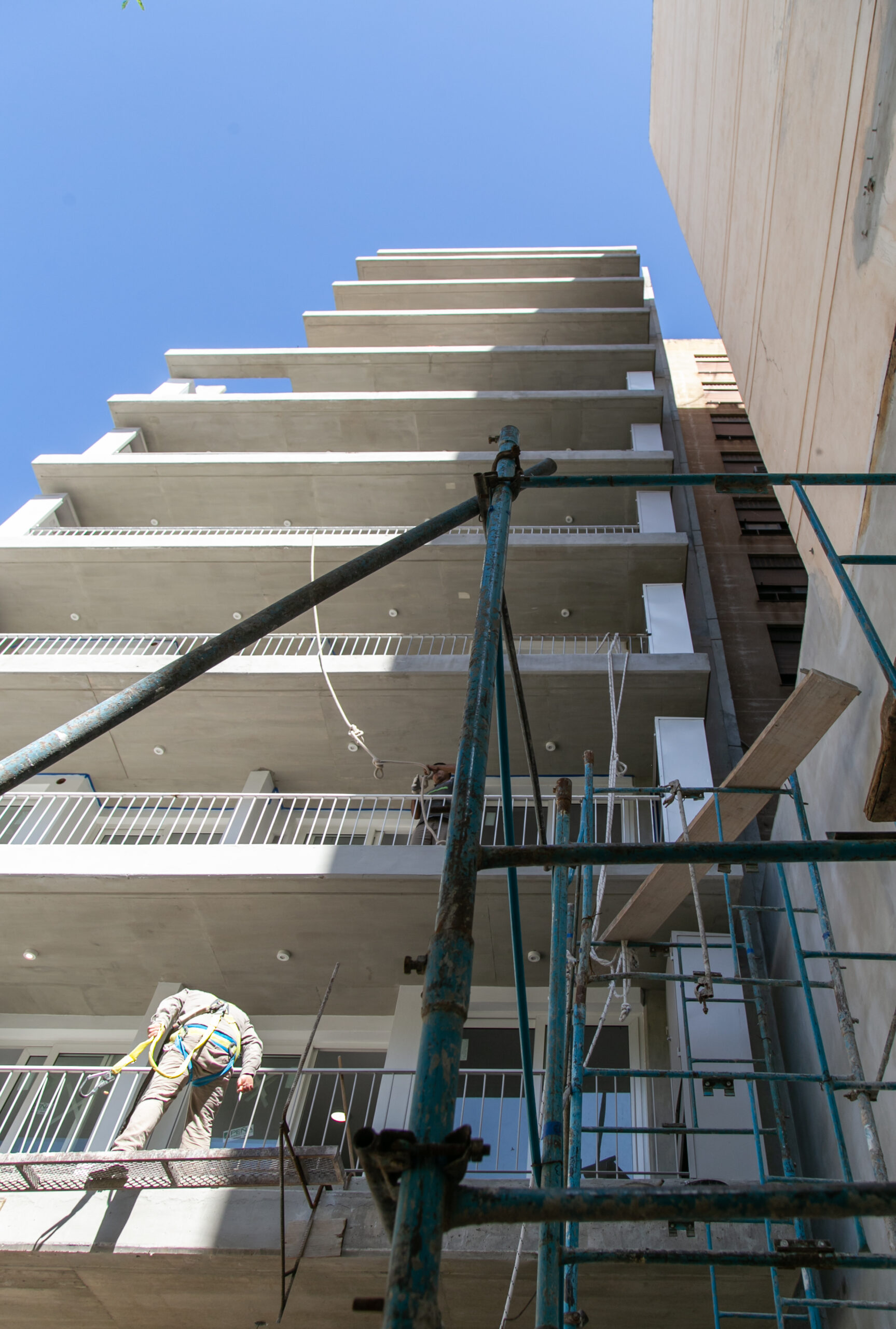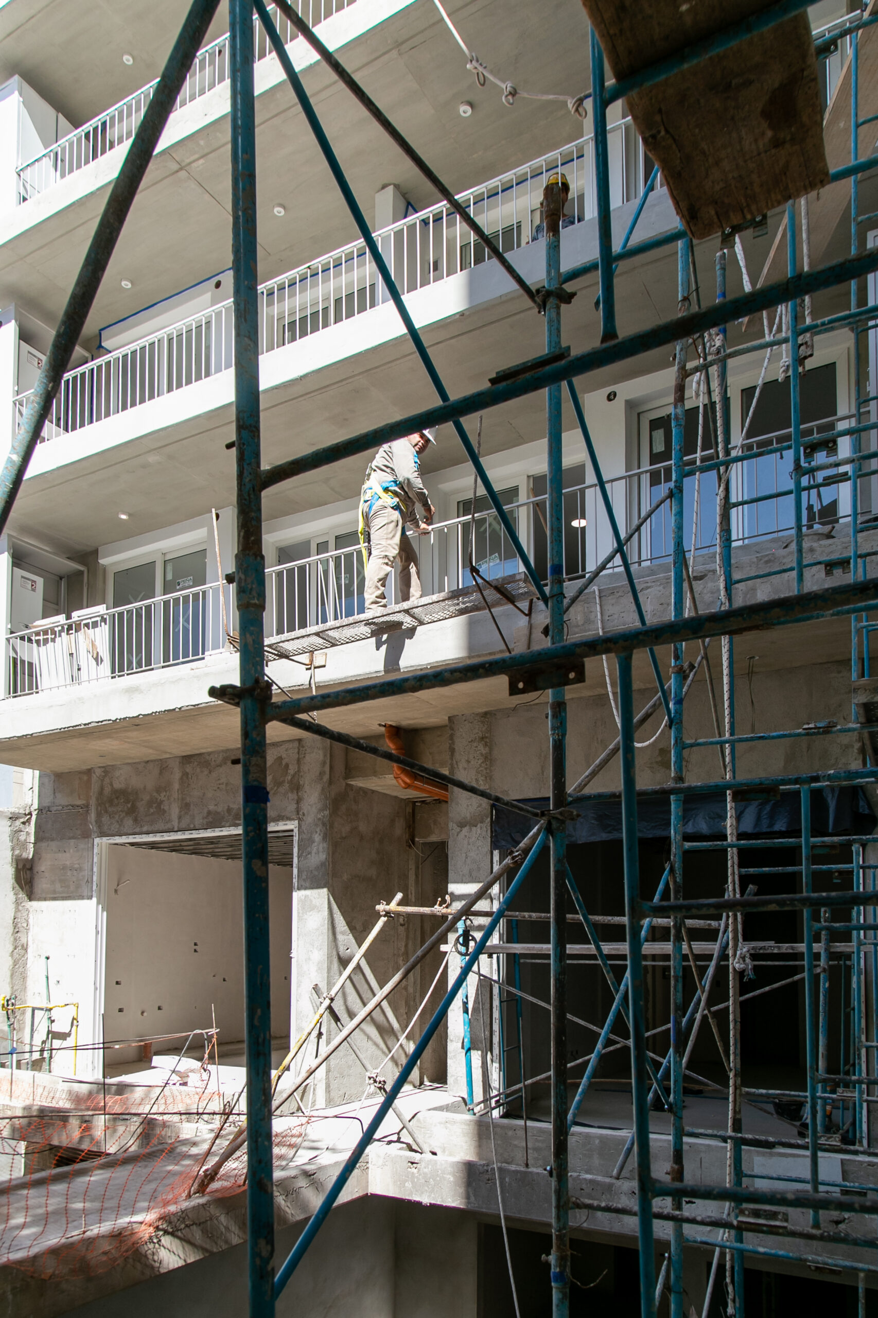 INTERIORES DE DPTO: COLOCACIÓN DE ABERTURAS EN PISOS SUPERIORES - CONTINÚA COLOCACIÓN DE MUEBLES Y MESADAS - COLOCACIÓN DE PISO VINILICO